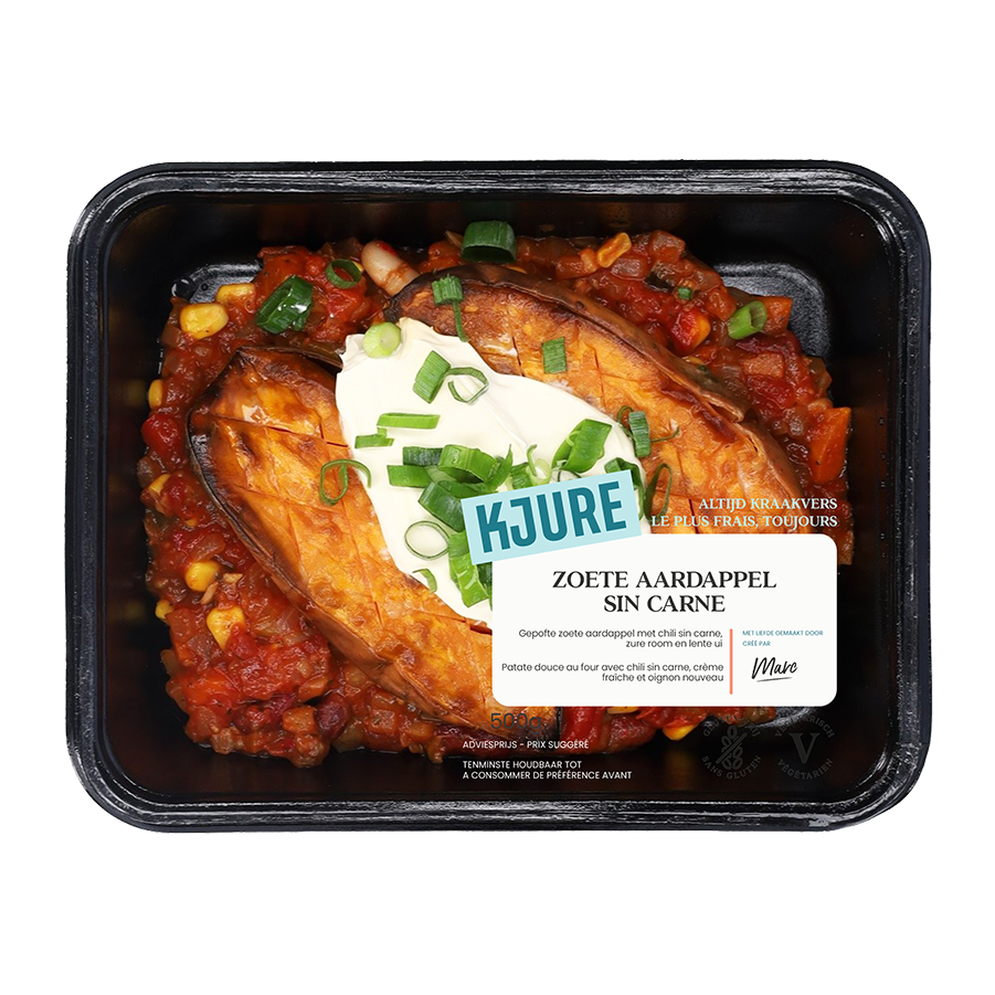 38.0% zoete aardappel, 14.3% tomaat, 9.7% zure room (melk, melkzuurfermenten), ui, 5.5% maiskorrels (maïs, water, zout), kerstomaat, 4.7% paprika, aubergine, selderij, wortel, rode bonen, plantaardige olie (olijf), chili peper (rood), koriander, knoflook, zout, gemodificeerd zetmeel (mais), jonge ui, komijn, paprikapoeder, cayennepeper, peper (zwart)