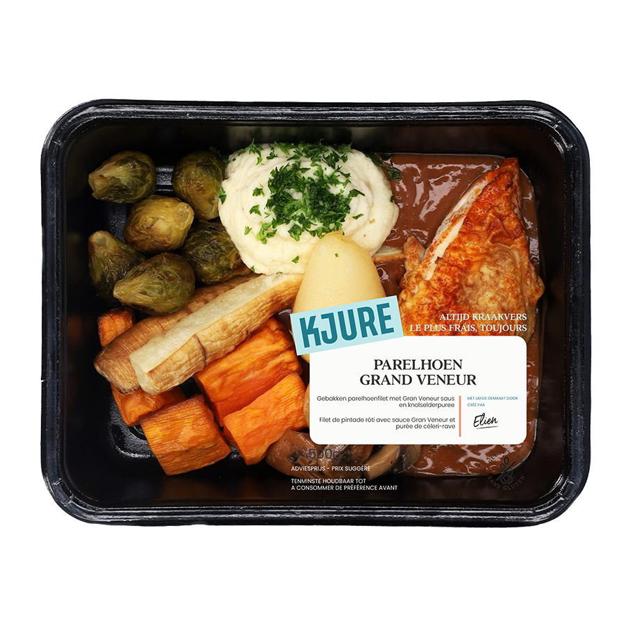 24% parelhoenvlees, 10% knolselderpuree (aardappelen, knolselder, room, boter, zetmeel (mais), zout, nootmuskaat, peper, water), 10% peterseliewortel, peren (peer, water, suiker, voedingszuur (E330), antioxidant (E300)), 8.5% spruiten, 8.3% zoete aardappel, 6.5% champignon, water, 4.2% knolselder, veenbes, plantaardige olie (olijf, raapzaad), suiker, rode bessen gelei (geconcentreerde rode bessensap, suiker, glucose-fructose siroop, geleermiddel (E440a), voedingszuur (E330)), room, rode wijn, wildfond (geconcentreerde wildbouillon (rundsvlees, hertenvlees, zout (zee), water, extract (rundsvlees), rundervet), maltodextrine, extract (gist), dextrose, extract (plant), extract (rode wijn), tomatenpuree), ajuin, gemodificeerd zetmeel (mais), porto, zout, rundsfond (extract (extract (rund), water), dextrose, maltodextrine, zout, suiker), 0.2% peterselie, tomatenconcentraat, look, mosterd, azijn, extract (ajuin, wortel, selderij, bloemkool), paprikapoeder, knoflook, peper (zwart), gekarameliseerde suiker, stabilisator (E406), tijm, jeneverbes, laurier, dextrose, zetmeel (rijst), aroma (natuurlijk), kruidnagel, emulgator (E322)