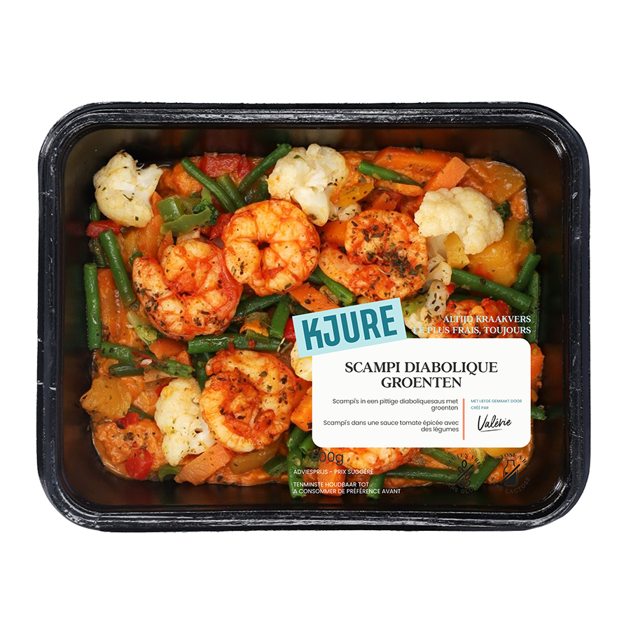 18.4% garnalen (garnalen, water, bevochtigingsmiddel (E330, E331), zout), 13.6% tomaat, 9.6% pompoen, 9.6% wortel, 9.6% bloemkool, 9.5% bonen, 7.7% paprika, 7.6% broccoli, 6.5% ajuin, kokosmelk (kokosextract, water), water, knoflook, gember, plantaardige olie (zonnebloem, raapzaad), gemodificeerd zetmeel (mais), currypasta rood (gedroogde chili (rood), citroengras, knoflook, sjalot, zout, limoen, galangal, korianderzaad, kurkuma), paprikaconcentraat, zout, kruiden en specerijen (bevat mosterd, selderij), paprikagranulaat, ajuinpoeder